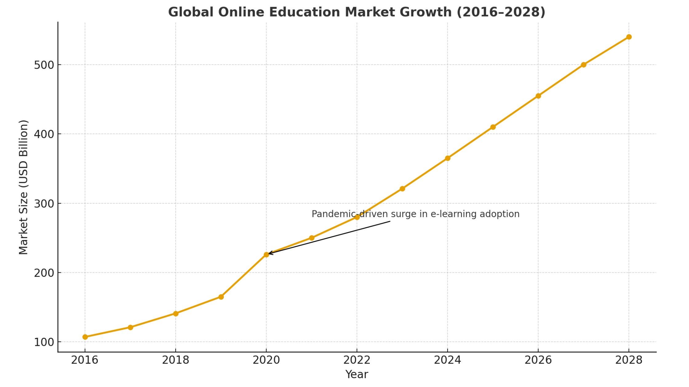 Global Online Education Market Growth (2016–2028): The global e-learning industry has grown rapidly, rising from $107 billion in 2016 to a projected $540 billion by 2028, driven by increased digital adoption and demand for flexible learning. (Sources: Statista, DemandSage, eLearning Industry)